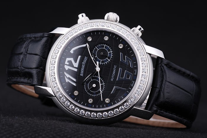 Bracelet: Black crocodile leather strap with heat embossed Audemars Piguet name and logo and an Audemars Piguet inscribed stainless steel flip-over hook clasp