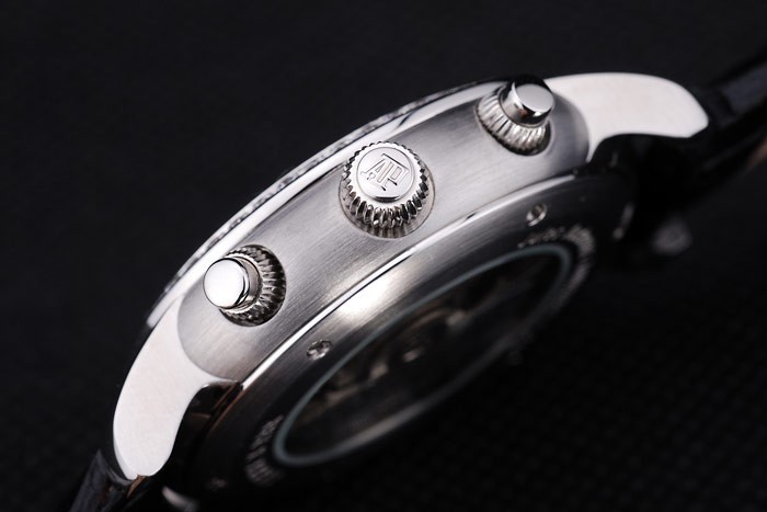 Crown: Stainless steel cutwork crown with Audemars Piguet logo and two smaller push-button crowns on either side of it