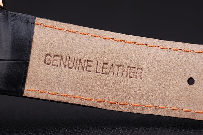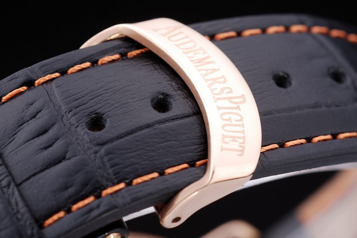 Bracelet: Black crocodile leather strap with orange stitching and heat embossed Audemars Piguet name and logo and an Audemars Piguet inscribed 18k rose-gold plated flip-over hook clasp
