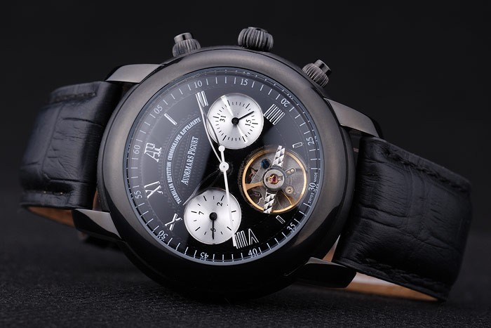 Crown: Ion-plated cutwork crown with Audemars Piguet logo and two smaller push-button crowns on either side of it