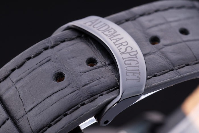 Bracelet: Black crocodile leather strap with heat embossed Audemars Piguet name and logo and an Audemars Piguet inscribed ion-plated flip-over hook clasp