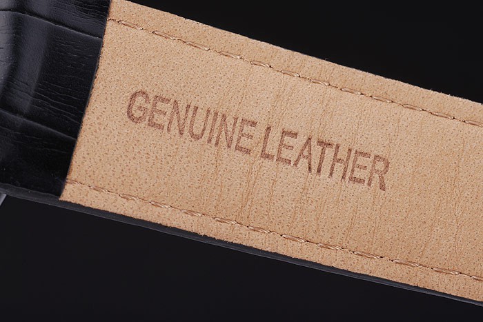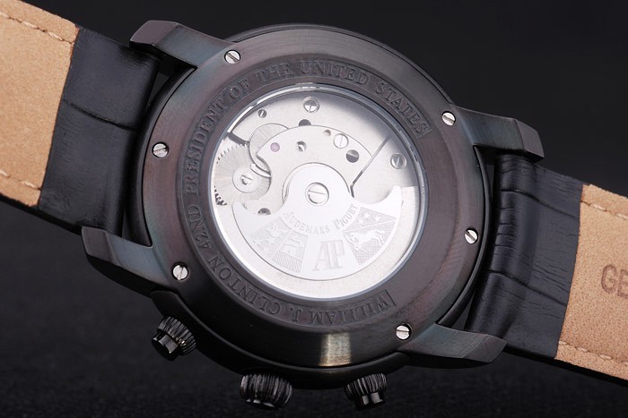 Bracelet: Black crocodile leather strap with white thread stitching and heat embossed Audemars Piguet name and logo and an Audemars Piguet inscribed ion-plated flip-over hook clasp