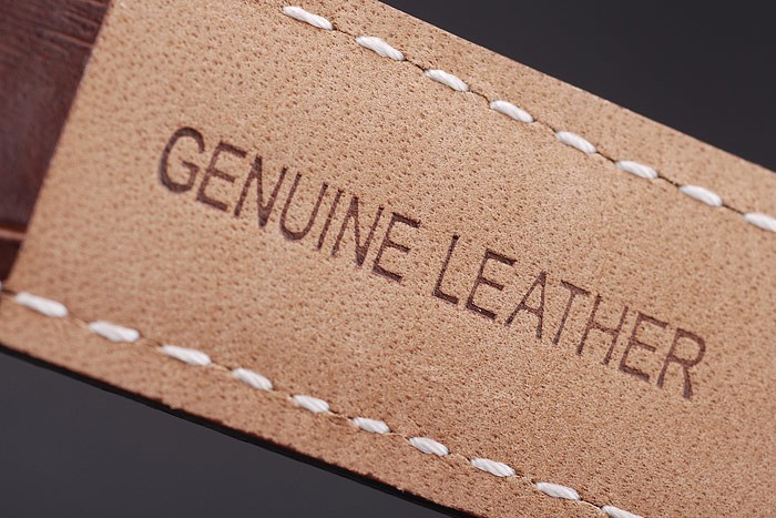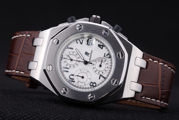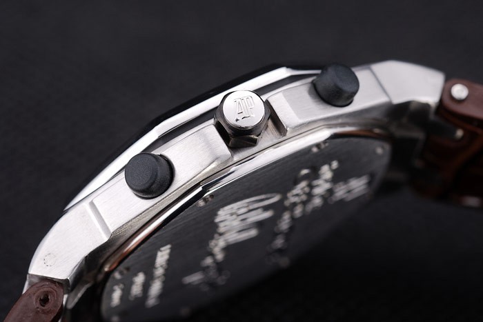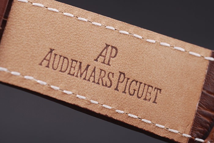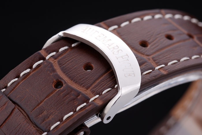Bracelet: Dark brown crocodile leather strap with white thread stitching and heat embossed Audemars Piguet name and logo and an Audemars Piguet inscribed stainless steel flip-over hook clasp