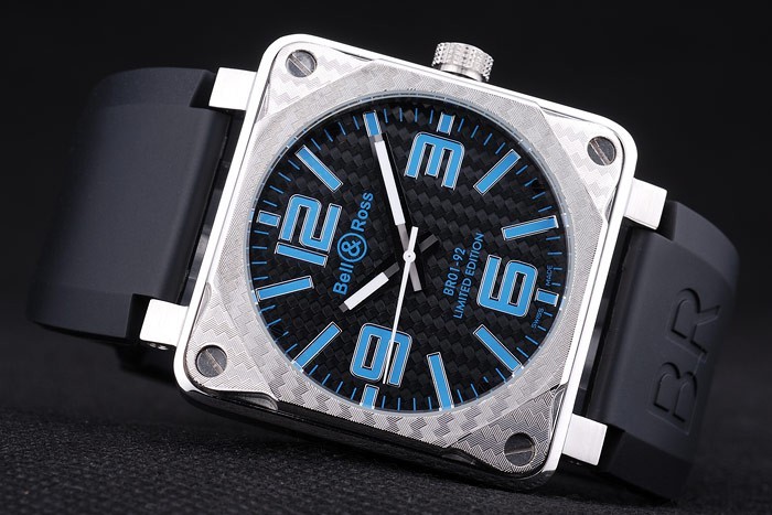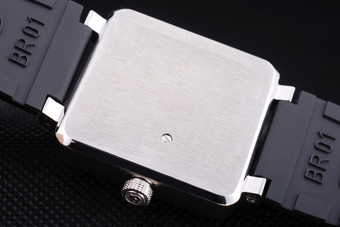 Bracelet: Bell & Ross logo and product code embossed black rubber strap with stainless steel hook-buckle clasp