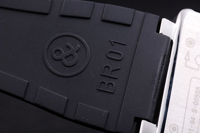 Bracelet: Black rubber strap with heat embossed logo, model number and product code and BR engraved brushed stainless steel hook-buckle clasp