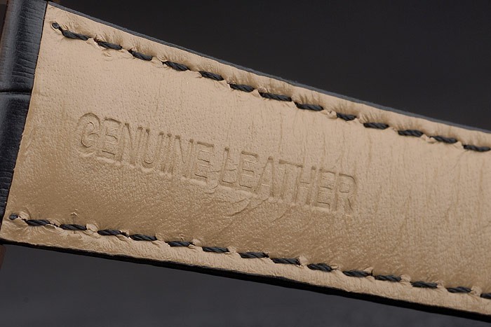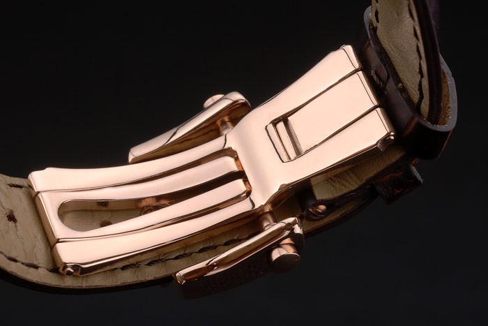 Bracelet: Breguet heat embossed black crocodile leather strap with Brequet engraved 18k rose-gold plated fold-in hook-buckle clasp