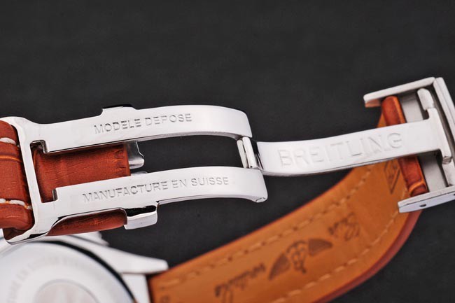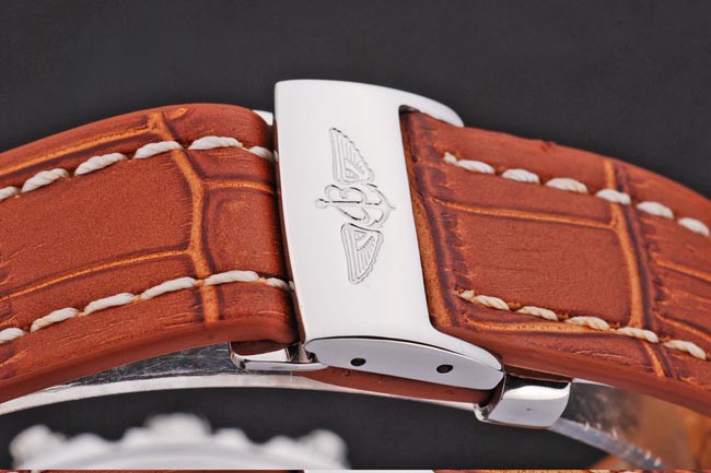 Bracelet: Russet red high-grade leather in a crocodile pattern, with heavy white cotton stitching. Inner band is embossed with the Breitling name and logo, and has a steel buckle closure.
