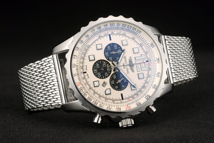 Crown: Polished stainless steel cutwork crown with Breitling logo and two small round push-button crowns on either side of it