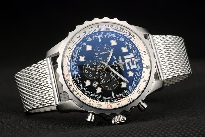 Crown: Polished stainless steel cutwork crown with Breitling logo and two small round push-button crowns on either side of it