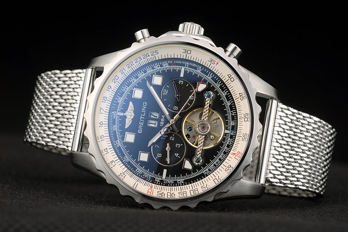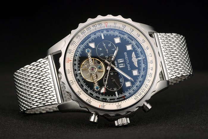 Crown: Polished stainless steel cutwork crown with Breitling logo and two small round push-button crowns on either side of it