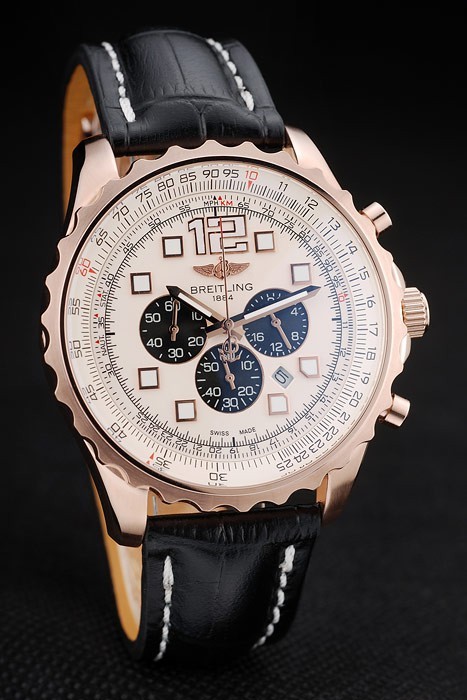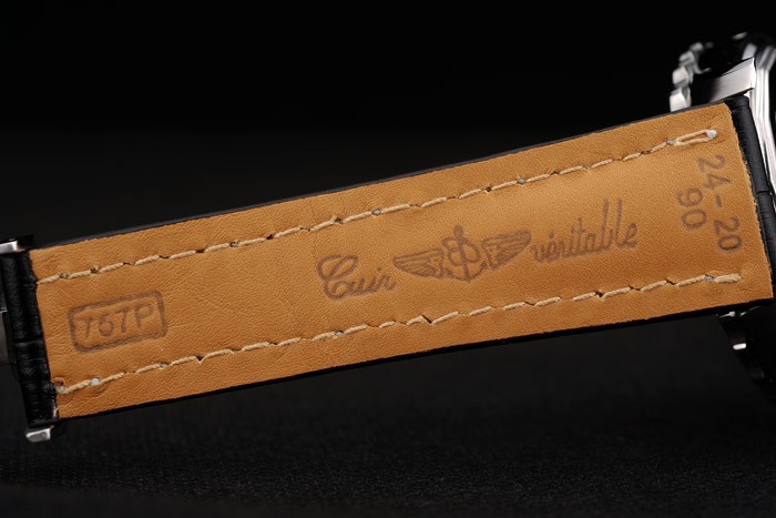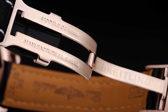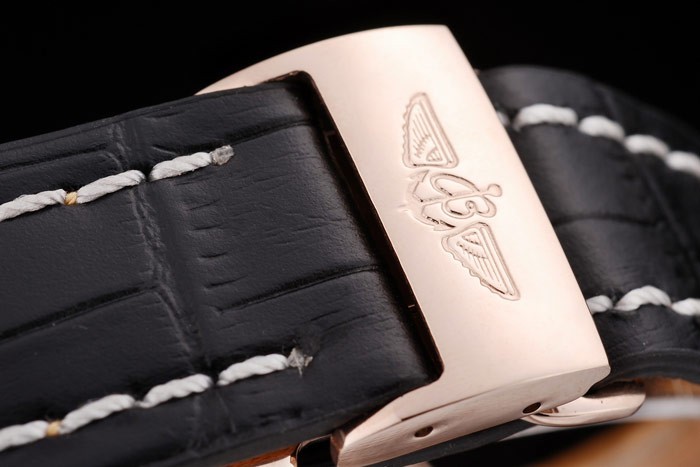 Bracelet: Heat embossed Breitling name and logo black crocodile leather strap with white thread stiching and logo engraved rose-gold plated fold-in clasp