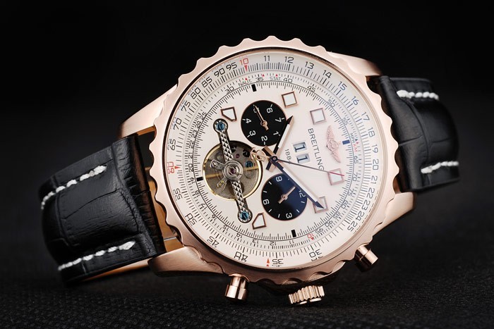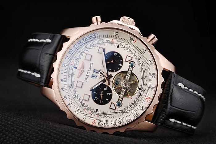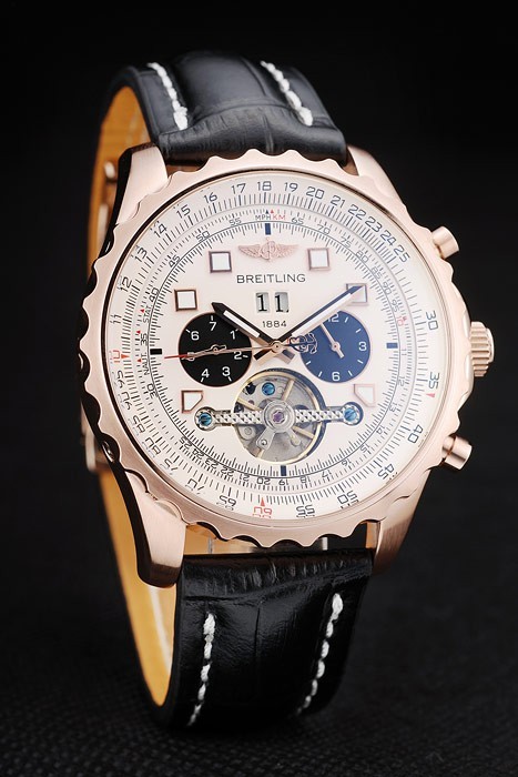 Bracelet: Heat embossed Breitling name and logo black crocodile leather strap with white thread stiching and logo engraved rose-gold plated fold-in clasp