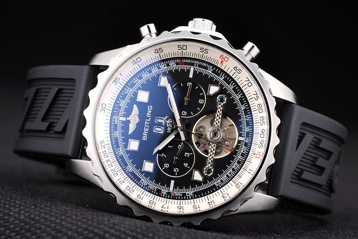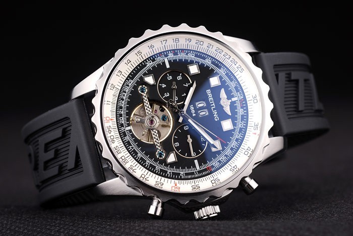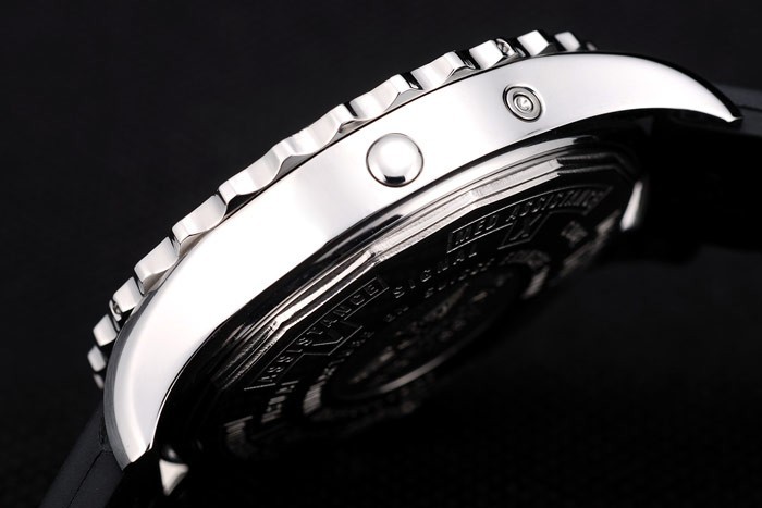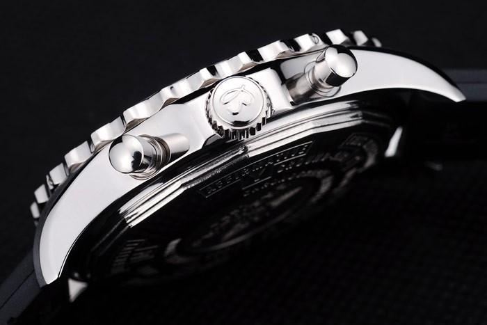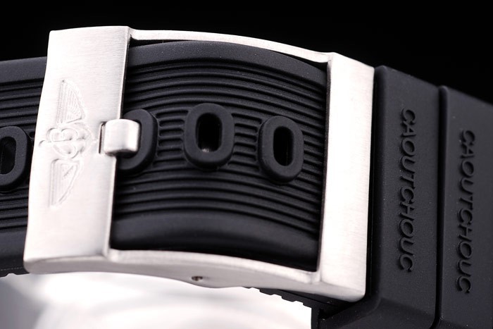 Bracelet: Black rubber strap with Breitling logo engraved stainless steel hook-buckle clasp