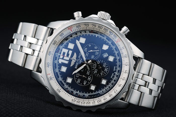 Crown: Polished stainless steel cutwork crown with Breitling logo and two smaller stainless steel push-button crowns on either side of it
