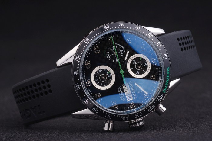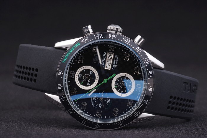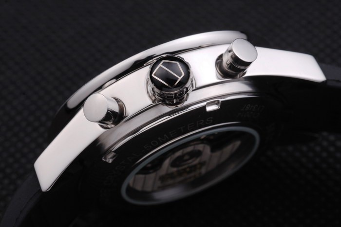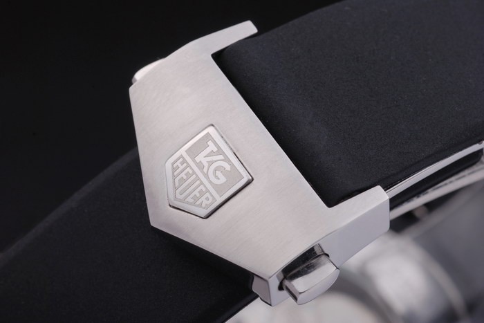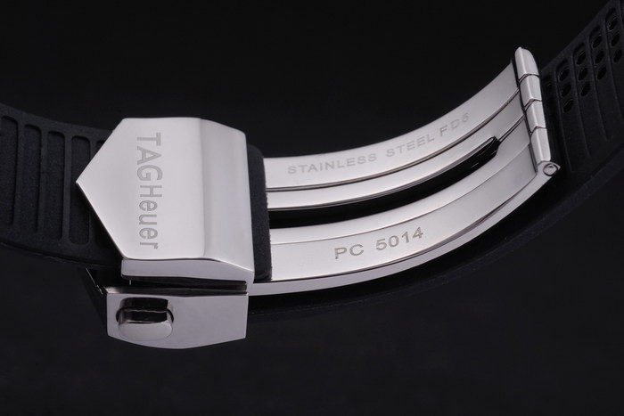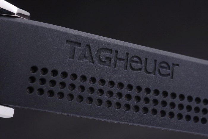Bracelet: Black rubber strap with Tag Heuer marking and a brushed stainless steel deployment clasp