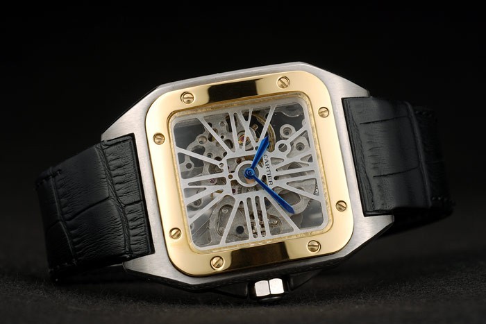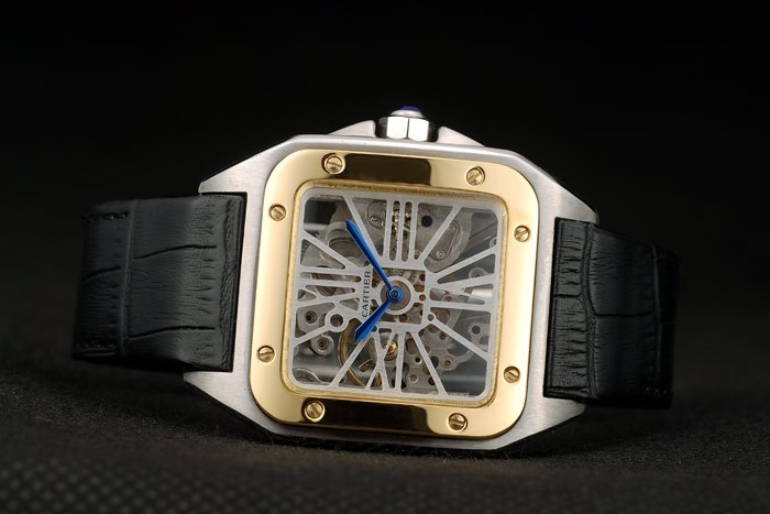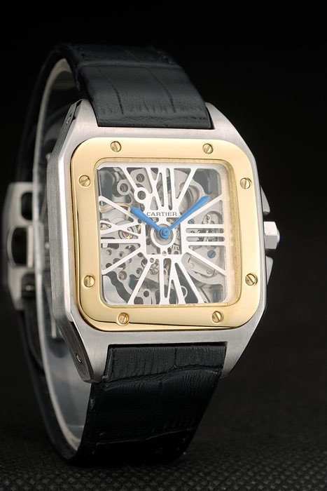 Bracelet: Cartier heat embossed black crocodile leather strap with brushed stainless steel snap-in clasp with push release button on the side
