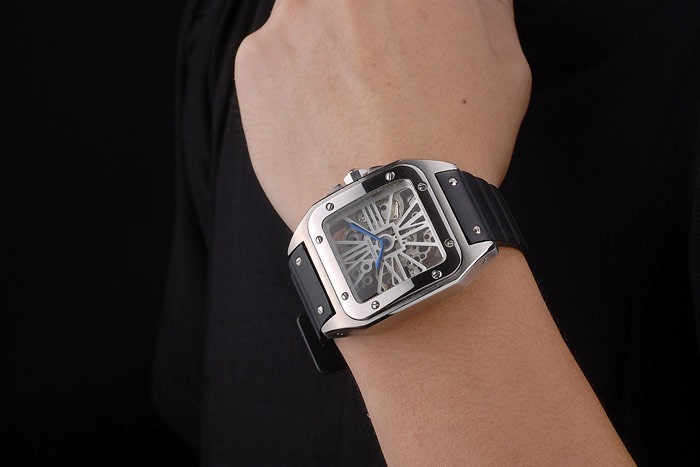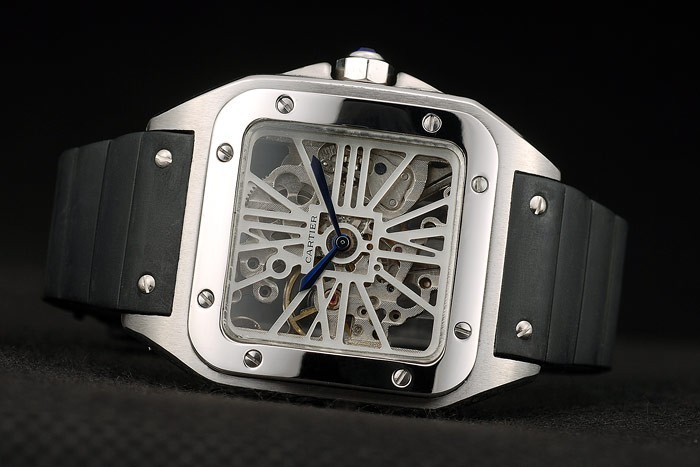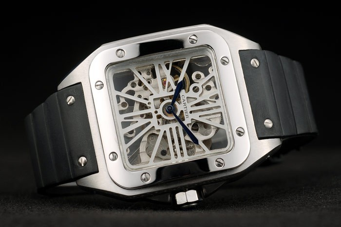 Bracelet: Black rubber strap with Cartier inscribed brushed stainless steel hook-buckle clasp