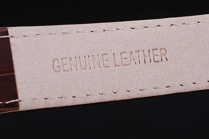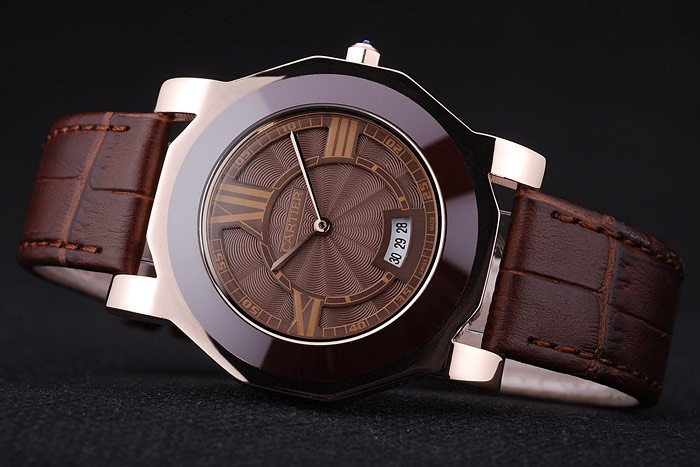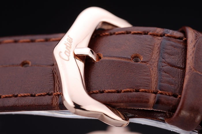 Bracelet: Heat embossed Cartier brown crocodile leather strap with Cartier inscribed rose-gold hook-buckle clasp
