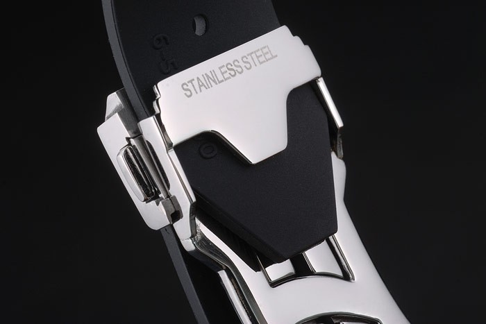 Bracelet: Hublot Geneve heat embossed ribbed black rubber strap with Hublot Geneve engraved brushed stainless steel push release hook clasp