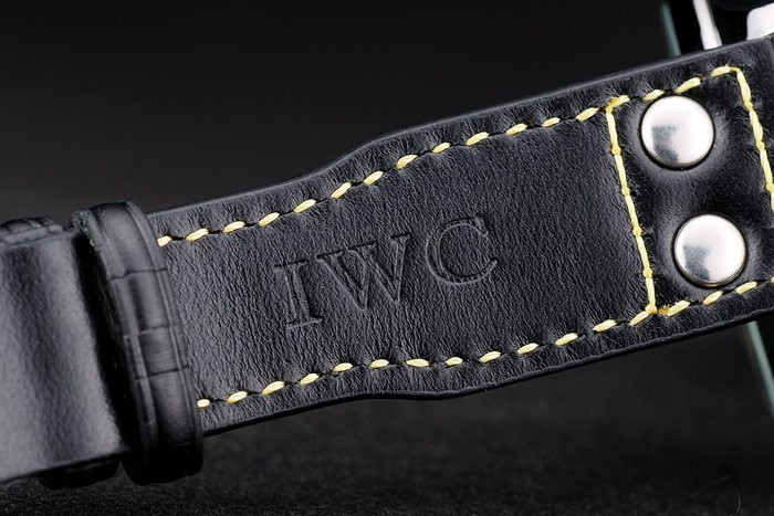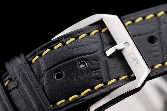 Bracelet: IWC heat embossed black crocodile leather strap with yellow thread stitching and IWC engraved brushed stainless steel hook-buckle clasp