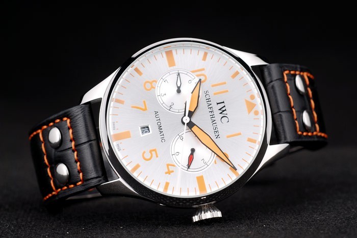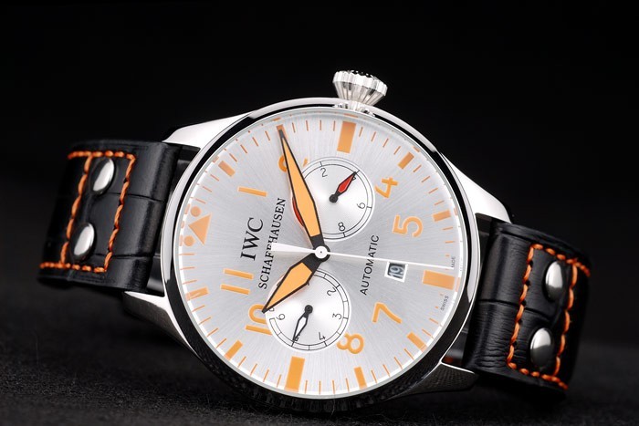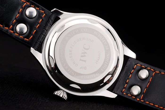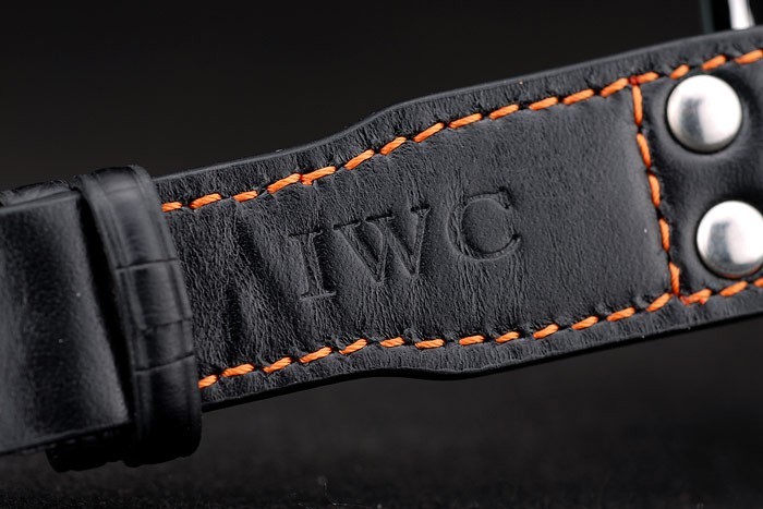 Bracelet: IWC heat embossed black crocodile leather strap with orange thread stitching and IWC engraved brushed stainless steel hook-buckle clasp