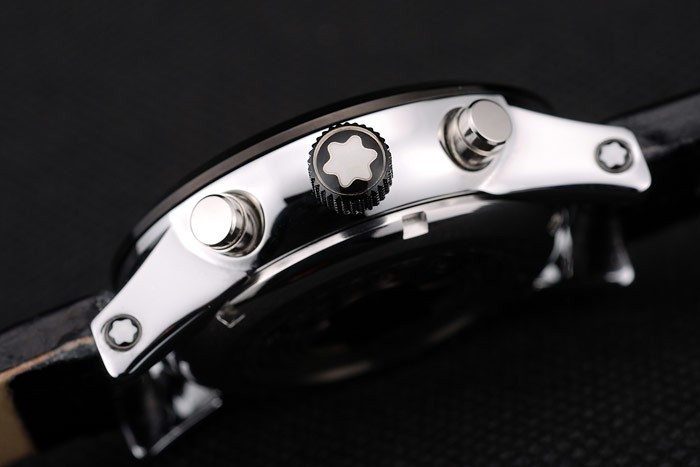 Crown: Ion-plated cutwork crown with MontBlanc logo and two polished stainless steel push button crowns on either side of it