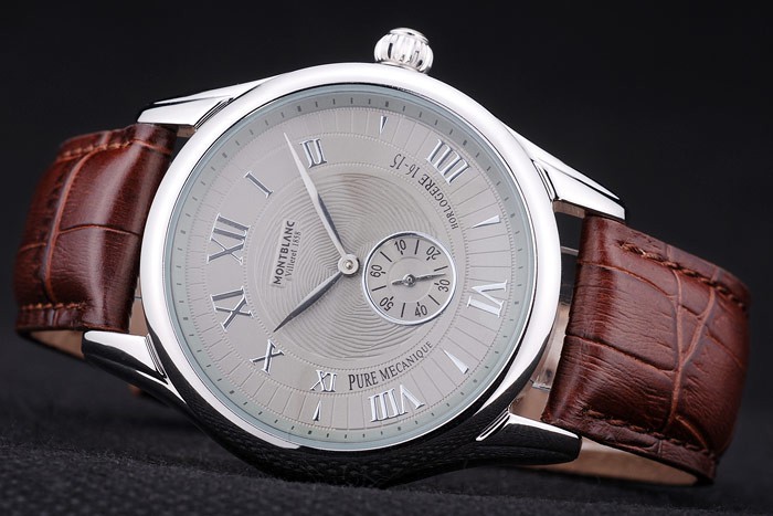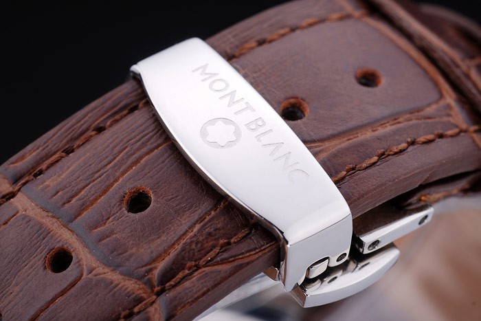 Bracelet: Heat embossed MontBlanc brown crocodile leather strap with MontBlanc name and logo engraved polished stainless steel flip-over hook clasp