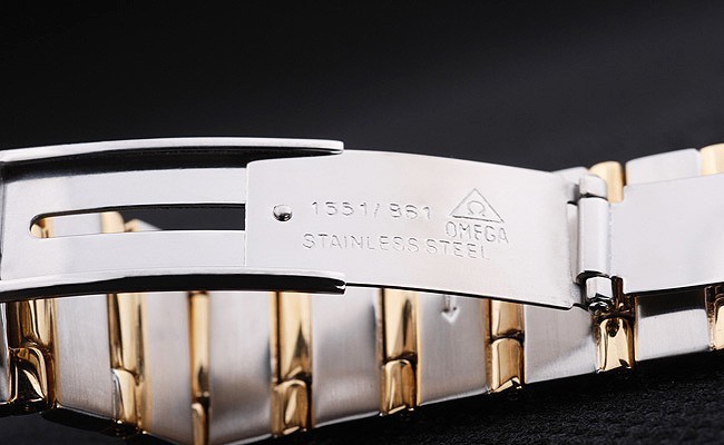 Bracelet: 18k yellow gold plated and brushed stainless steel link bracelet with Omega inscription fold-in clasp