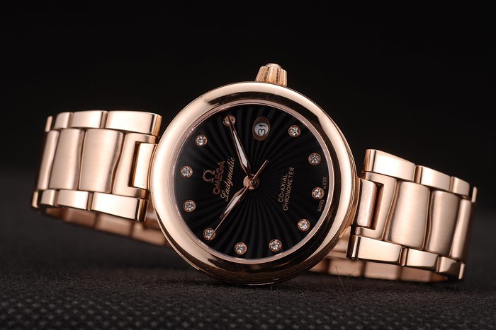 Back: 18k rose-gold plated screwed down back with Omega Ladymatic engraving