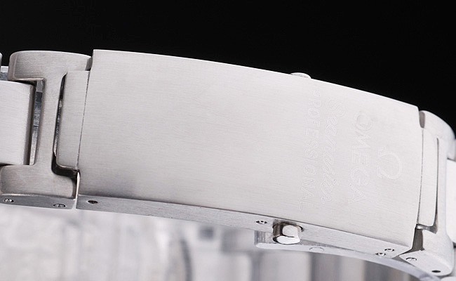 Bracelet: Brushed stainless steel link bracelet with Omega name and logo inscribed push button release deployment clasp