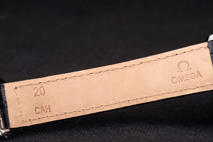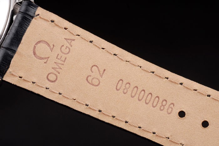 Bracelet: Black crocodile leather strap with heat embossed Omega stamp and stainless steel fold-in clasp with Omega logo on top