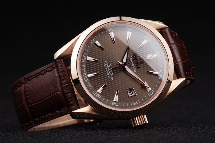 Bracelet: Brown crocodile leather strap with heat embossed Omega stamp and Omega inscribed 18k rose-gold fold-in clasp
