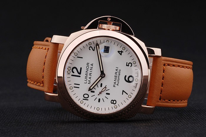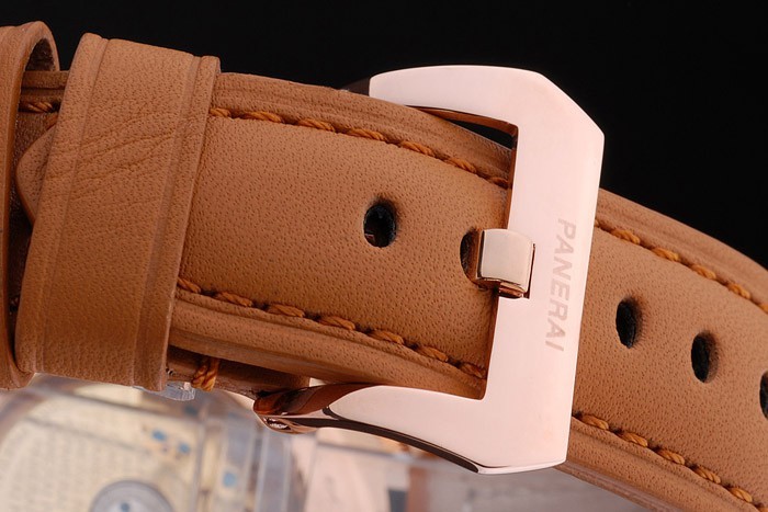 Bracelet: Orange leather strap with heat embossed Luminor Panerai stamp and Panerai marked 18k yellow gold plated hook-buckle clasp