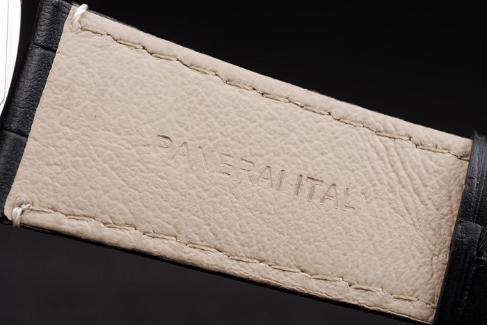 Bracelet: Black crocodile leather strap with white stitching and heat embossed Officine Panerai Italy stamp and brushed stainless steel hook-buckle clasp with Panerai engraving
