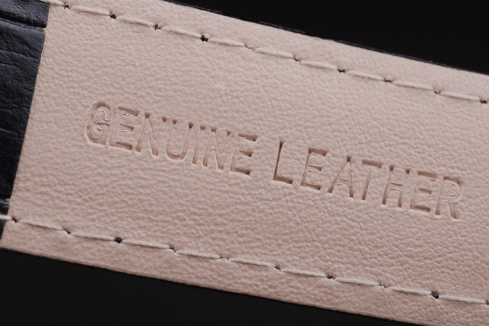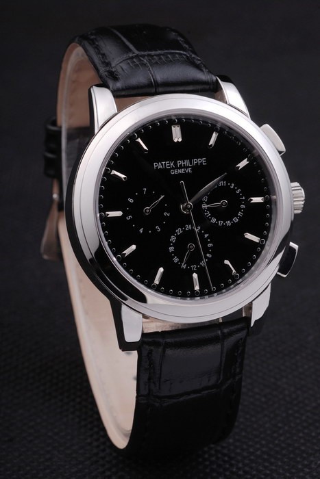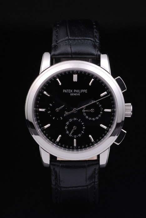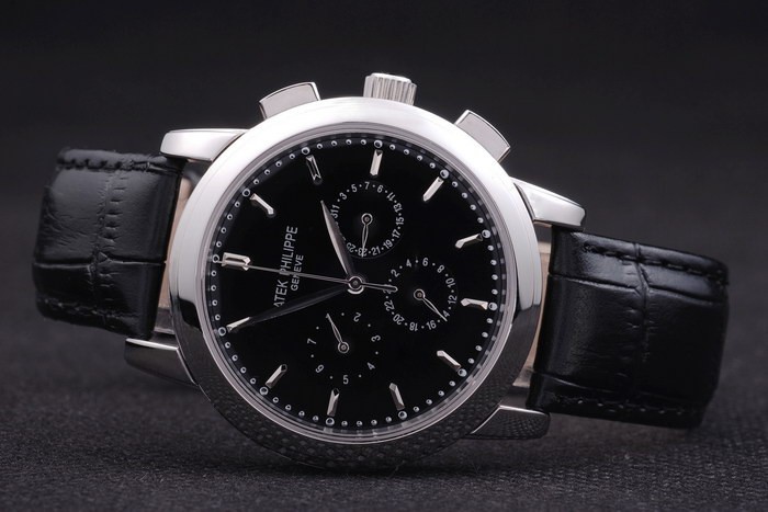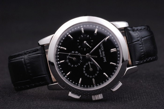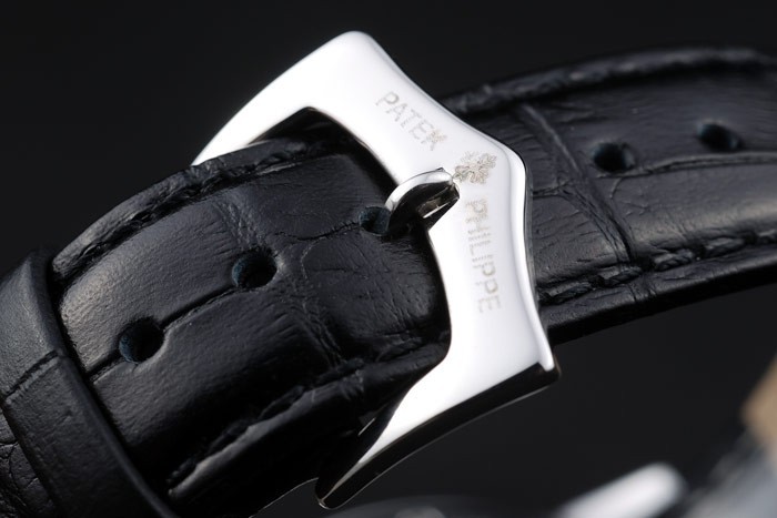 Bracelet: Black leather strap with Patek Philippe stamp and a stainless steel fold in clasp