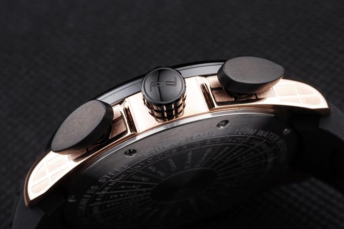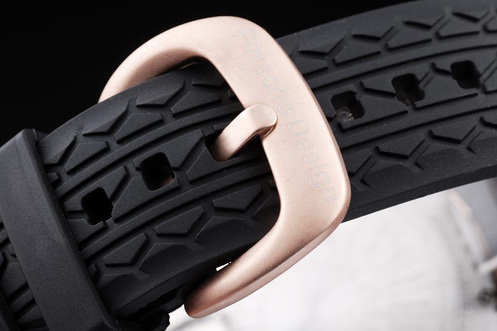 Bracelet: Tyre-groove black rubber strap with heat embossed Porsche stamp and rose-gold hook-buckle clasp with Porsche inscription