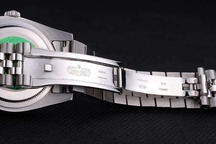 Back: Stainless steel push-in case back with green Rolex logo stamp