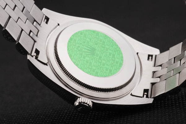Back: Push in stainless steel back with green Rolex sticker and markings