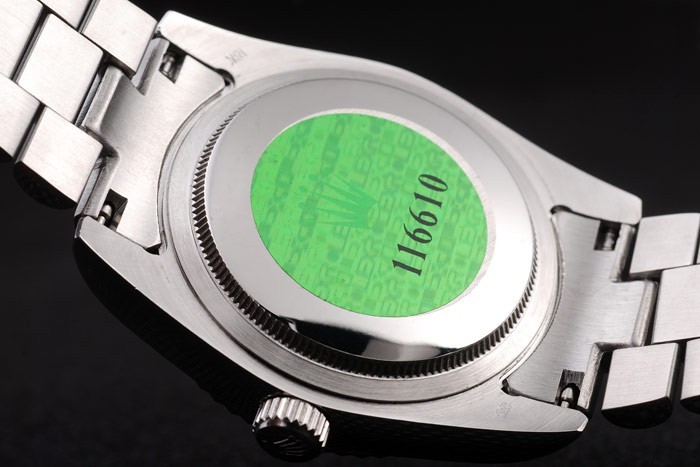 Back: Stainless steel push-in case back with green Rolex logo stamp
