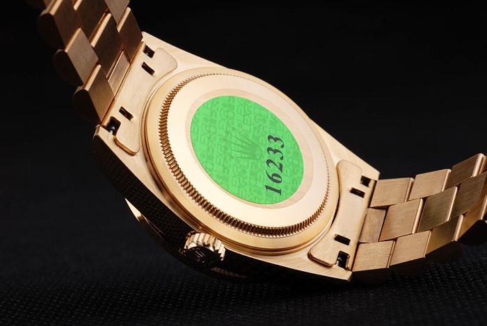 Back: 18k yellow gold plated stainless steel push-in case back with green Rolex logo stamp