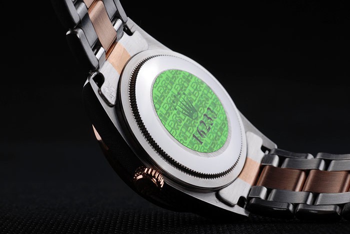 Back: Stainless steel push-in case back with green Rolex logo stamp
