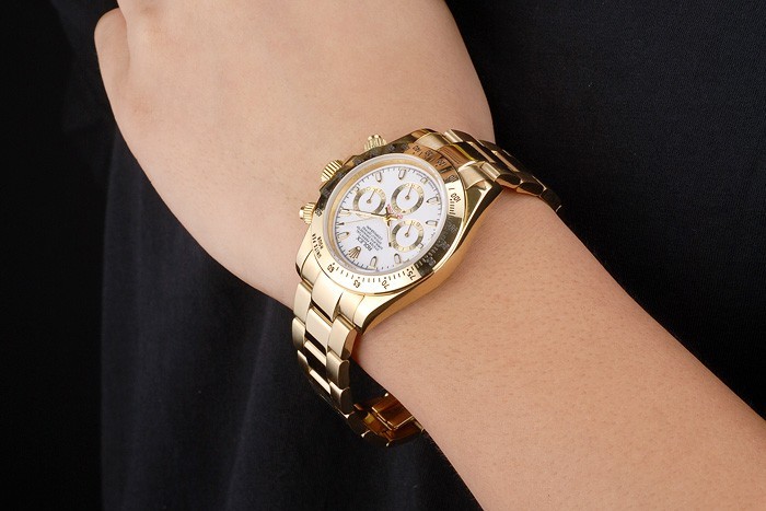 Back: Gold-toned stainless steel push-in case back with Rolex engraving
