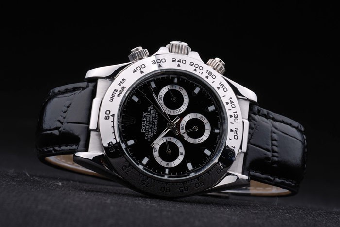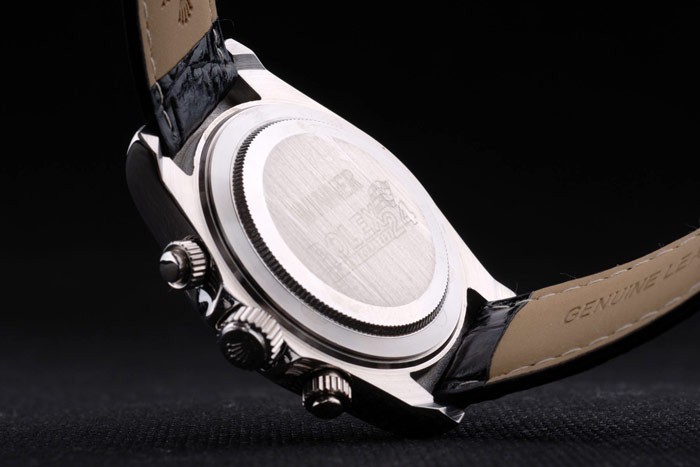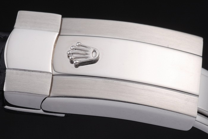 Bracelet: Black patent snake leather strap with Rolex and logo engraving and stainless steel deployment clasp displaying Rolex logo
