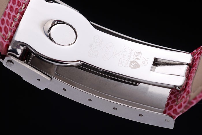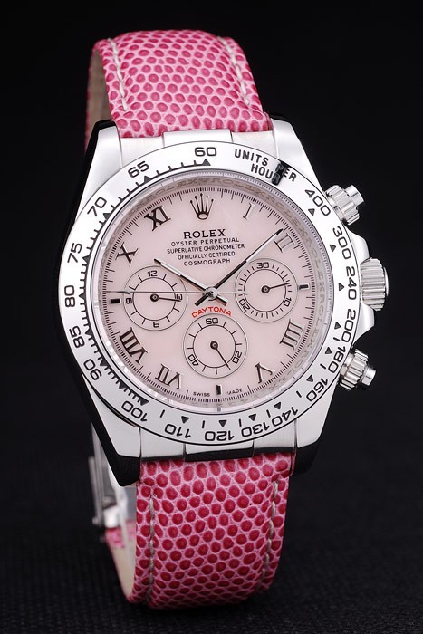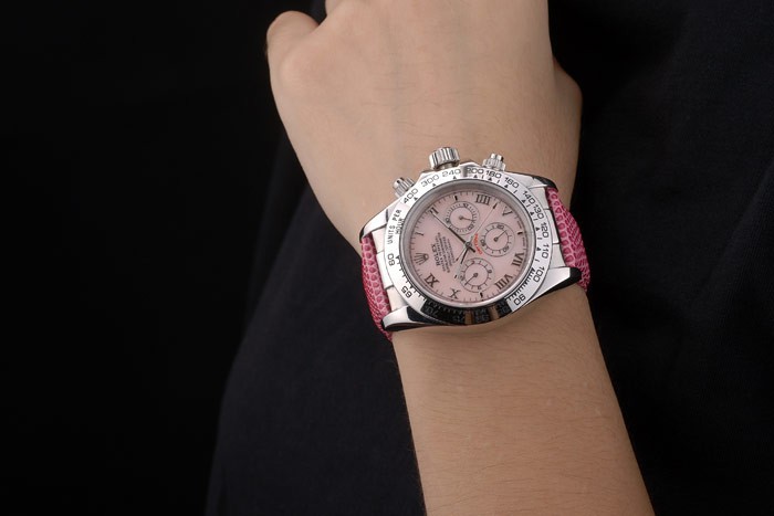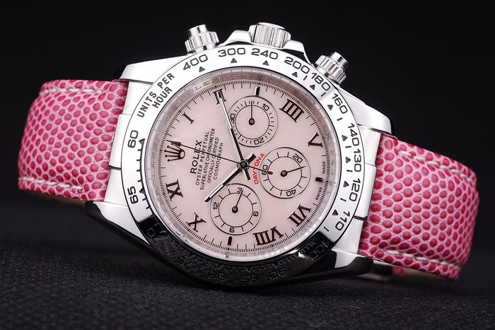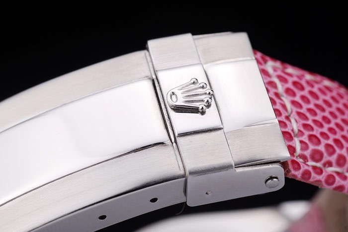 Bracelet: Pink snake leather strap with Rolex and logo engraving and stainless steel deployment clasp displaying Rolex logo