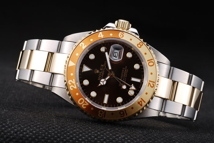 Bracelet: Yellow gold plated and brushed stainless steel link bracelet with engraved deployment clasp with Rolex logo on top
