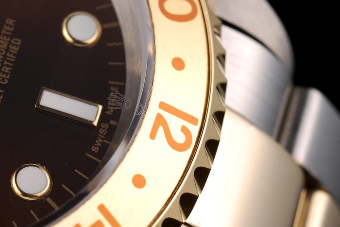 Bezel: Gold and orange ceramic cutwork bezel with 24-hour marker in Arabic numerals