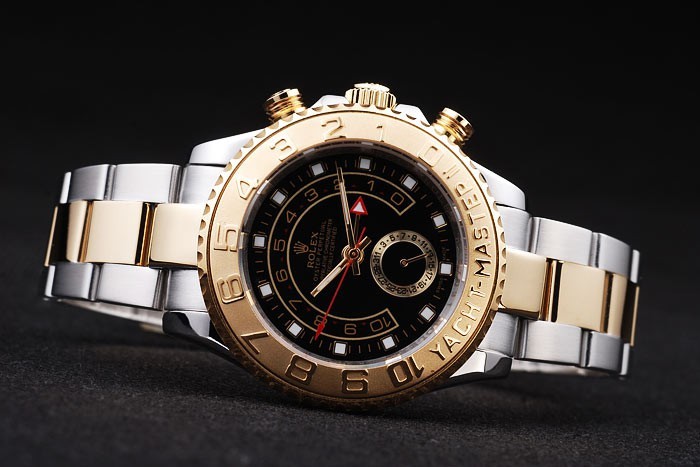 Bezel: Rose gold plated unidirectional cutwork bezel with 1 to 10 markings and Yacht Master engraving on a blue enameled background