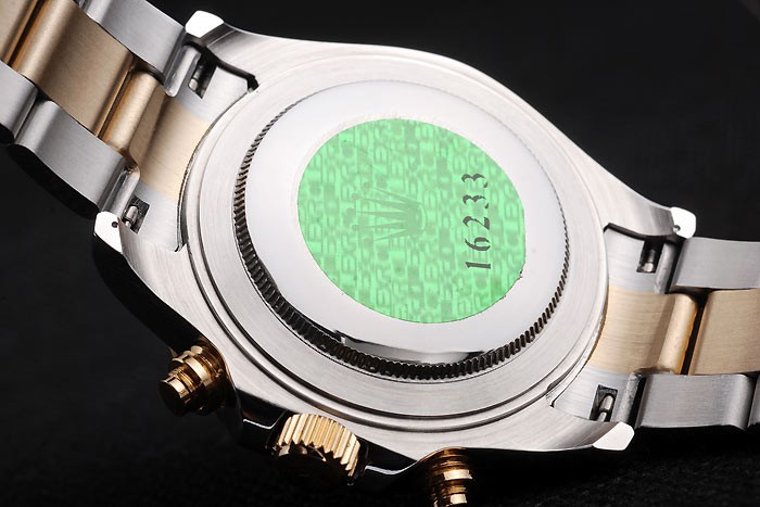 Back: Polished stainless steel push-in back with green Rolex logo stamp
