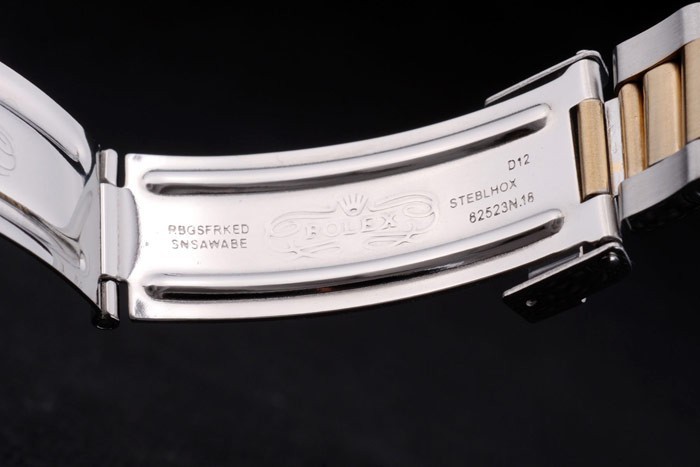 Bracelet: Two toned brushed and gold tone stainless steel link bracelet with Rolex engraving fold-in clasp displaying the Rolex logo