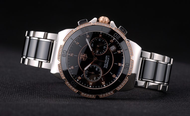 Crown: 18k rose-gold plated cutwork crown with Tag Heuer logo and two polished stainless push button crowns on either side of it